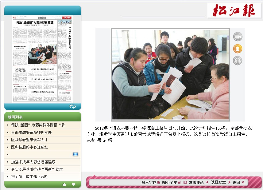 2月24日至25日,学院自主招生报名现场确认工作在综合教学楼底楼大厅进行。松江报对此进行了图片报道。