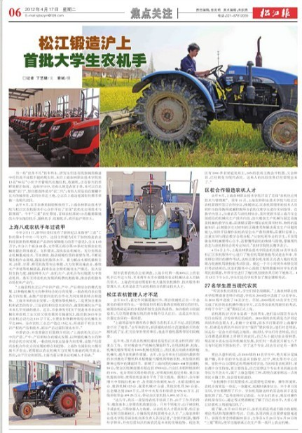 4月17日的松江报第6版“焦点关注”中整版报道了学院农机化班动态,题为“松江锻造沪上首批大学生农机手”。