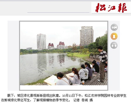 《松江报》报道的是在10月11日进行的一次湖畔造景写生课。写生课旨在通过现场绘图来提高对松江中央公园的秋季设计理念的认识和学生的园林审美观。专注于绘图的同学吸引了很多市民的注意力,同时也吸引了《松江报》记者的采访报道。