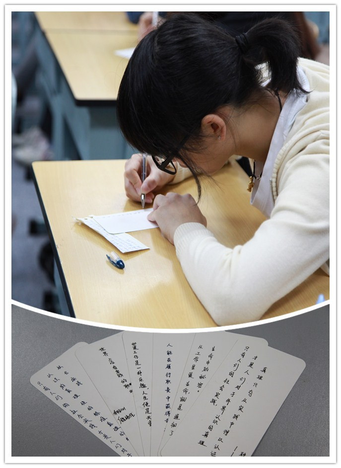 徐帆老师趁势发问“干一行,爱一行,是不是要求我们一辈子只能从事一份工作?”。同学们踊跃发言,畅谈观点,并讲述自己熟悉的、身边的爱岗敬业模范。通过点评和总结,升华爱岗敬业内涵。讲座中,师生还诵读了《公民道德歌》之爱岗敬业篇。每位同学又在书签上书写有关爱岗敬业的名言,作为今后踏上工作岗位的座右铭。