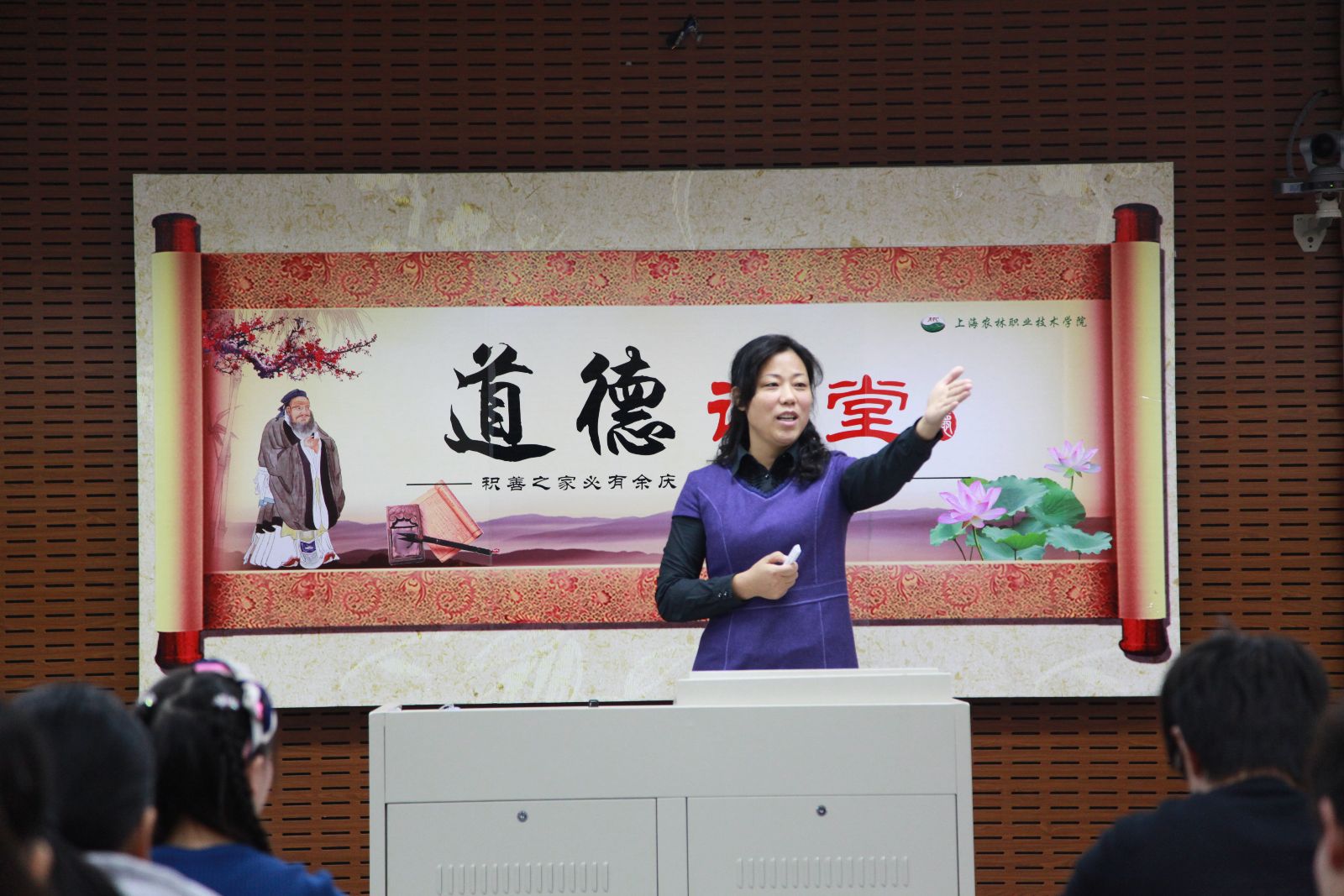 周琴妹、高传祥、陈彦灵、钱丽丽四位同学聚焦文明礼貌、助人为乐、爱物公物、保护环境等内容,通过图片对比、名人名言阐释、日常文明用语讲解等形式,现身说法。王继红老师对同学们的发言逐一分析点评和总结,并重申了社会公德的基本要求。期间,师生还共同学唱《公民道德歌》,诵读“上海‘七不’、大学校园‘十不’”等规范内容。