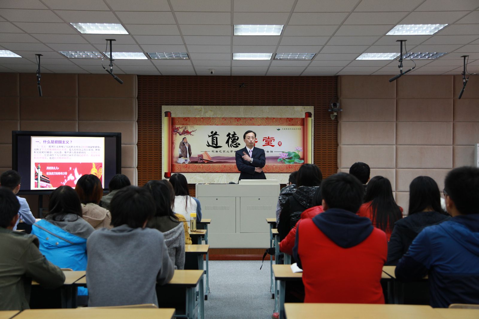 11月20日下午,道德讲堂第十二讲在综合楼403录播教室开讲,由思政部姜志强老师主讲《今天,我们应该怎么爱国?》,园艺园林系园艺134班32人参与互动。