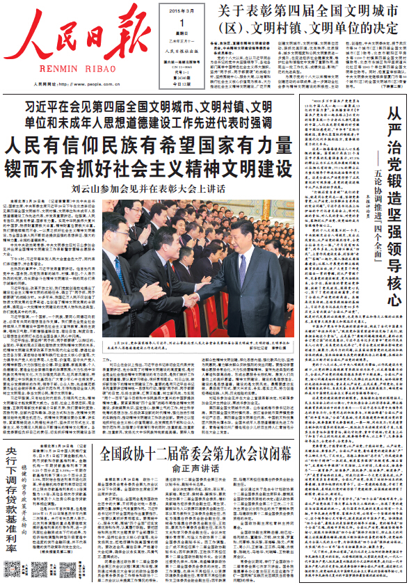 今天的人民日报头版,在报眼的醒目位置公布了《关于表彰第四届全国文明城市(区)、文明村镇、文明单位的决定》,学院榜上有名。