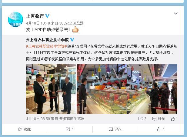 昨天上午,上海教育委员会官方微博转发了我院官方微博“教工APP自助点餐系统”的信息,累计阅读量上万次。内容如下: