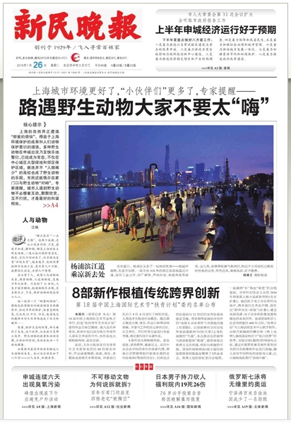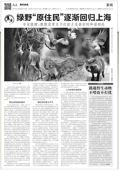 7月26日,新民晚报头版以核心提示的形式,报道了上海城市环境更好了,“小伙伴们”更多了,专家提醒——路遇野生动物大家不要太“嗨”。文字报道详见A04版要闻。我院动物专家顾剑新教授接受了采访,给市民提出爱护动物的好建议。