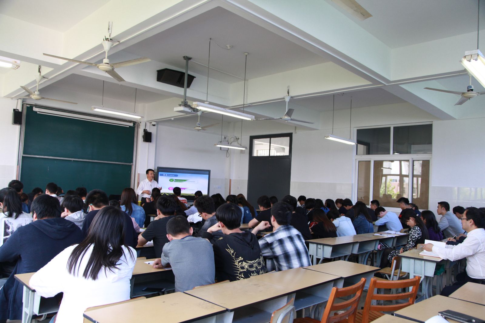 在一个半小时里,谢锦平通过上海农业领域的典型案例,向大家介绍了现代农业技术的发展历程和概况,并现场演示了学院农业物联网管控系统,让学生大开眼界。旅管161班邵玉杰同学说:“谢老师的课对我很有启发,他介绍崇明区和奉贤区的循环农业技术案例激发了创业梦想,我想毕业后搭建一个农村旅游休闲平台,将乡村游和特色农产品结合起来,发展观光农业、体验农业。”休闲161班徐聪同学说:“谢老师的课让我感受到现在农业物联网技术很强大,也认清未来就业的方向。现代农业需要的是掌握高新技术的复合型人才,以后我不仅要学好本专业,还要学习计算机方面的知识,为将来就业多一条选择的道路。”