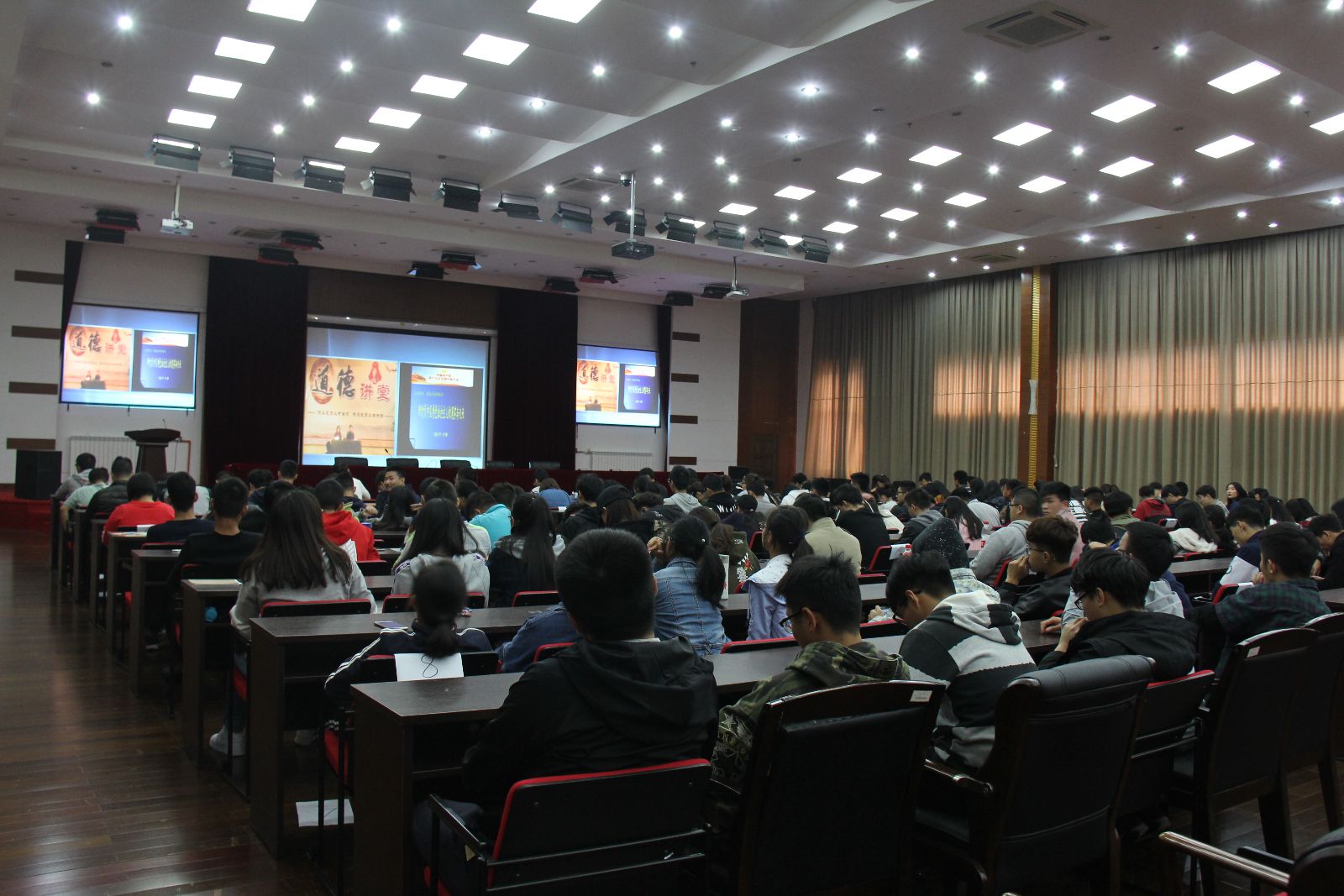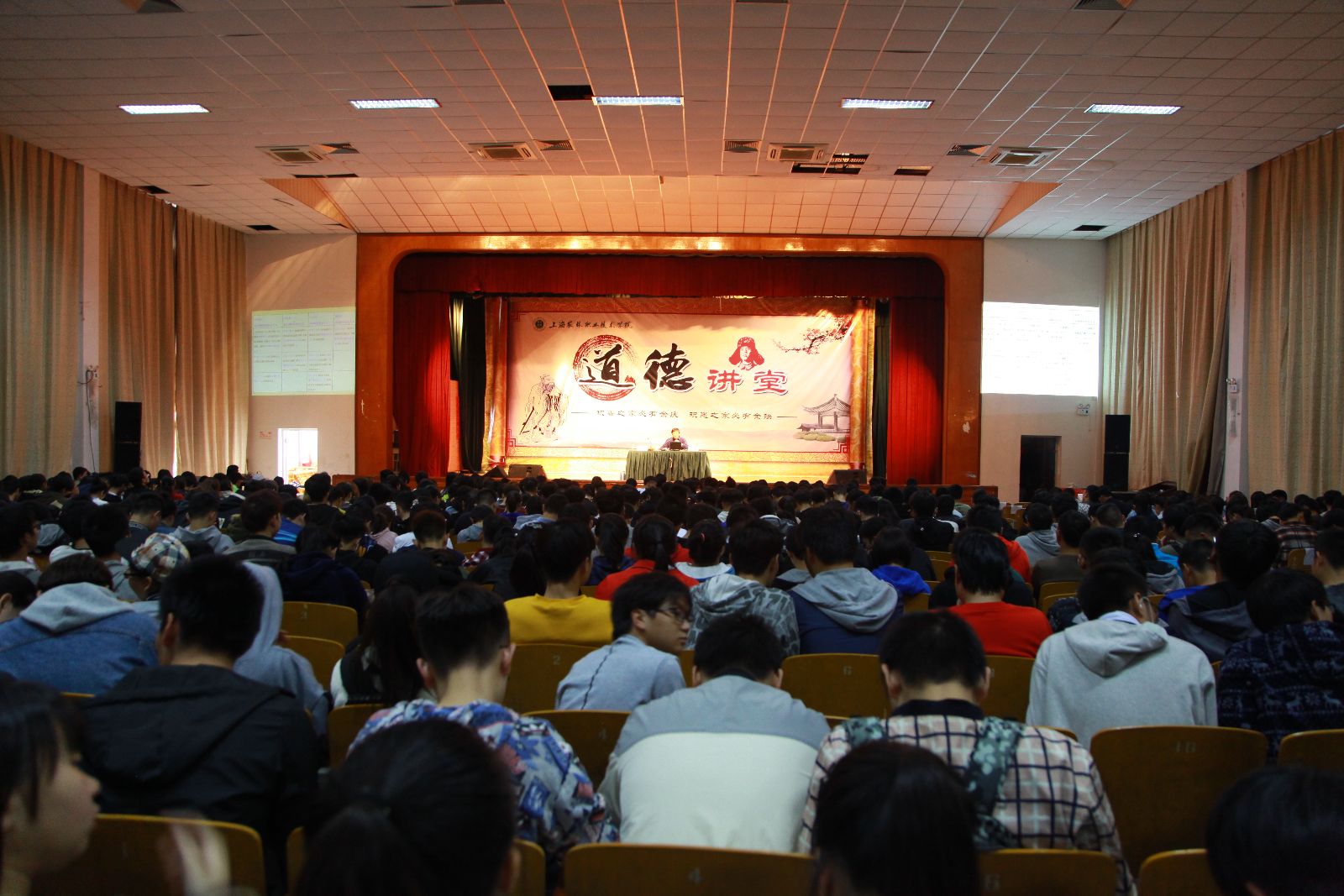 开展道德讲堂,既是我院复评全国文明单位的工作要求,也是我院思想政治理论教学课教学改革的重要部分。11月10日下午,学院2017年度道德讲堂开讲。近1200名2017级高职学生和2015级中高贯通班学生,分别在大礼堂主会场和205报告厅分会场,共同聆听上海大学李梁教授主讲“新时代中国特色社会主义的现实与未来”。宣传处处长、思政部主任樊清誉主持。