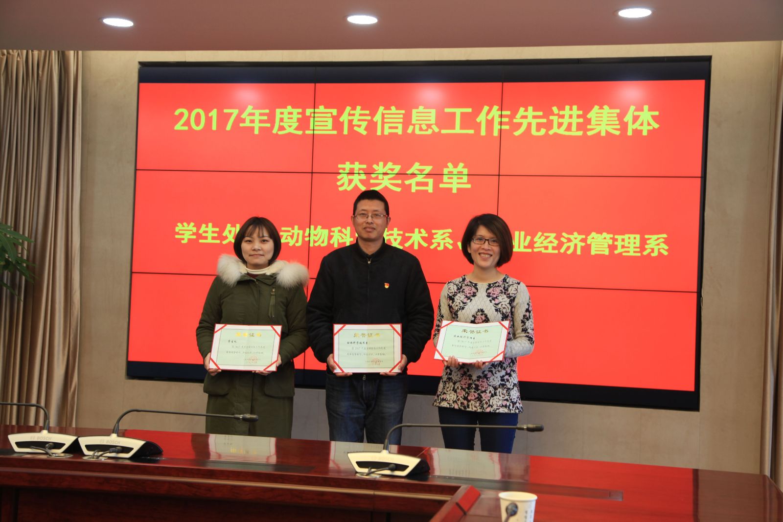 为总结经验、表彰先进,学院党委开展2017年度“好新闻”、宣传信息工作先进集体和先进个人评选活动。经过部门申报、信息工作领导小组评议、学院审批等程序,《学院召开巡察整改动员会》等10篇新闻被评为2017年度学院“好新闻”;学生处、动物科学技术系、农业经济管理系荣获2017年度宣传信息工作先进集体;张婧敏等12位同志荣获2017年度宣传信息工作先进个人。会上,俞锦禄对2017年度“好新闻”、宣传信息工作先进集体和先进个人进行了表彰。