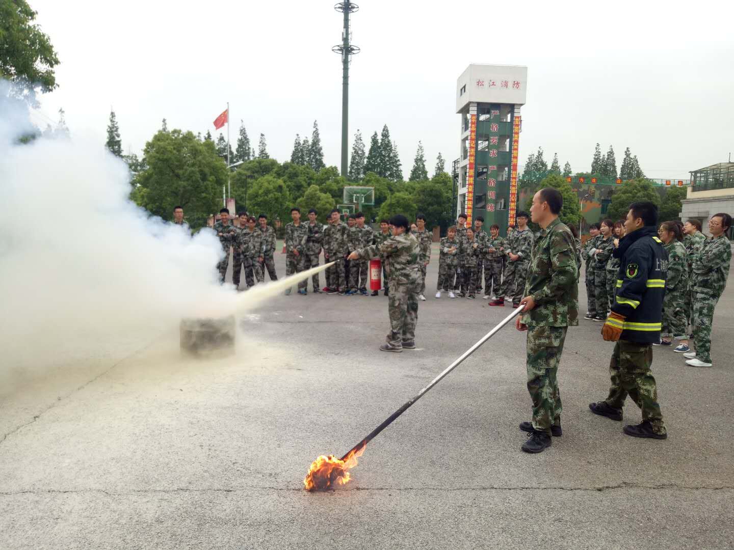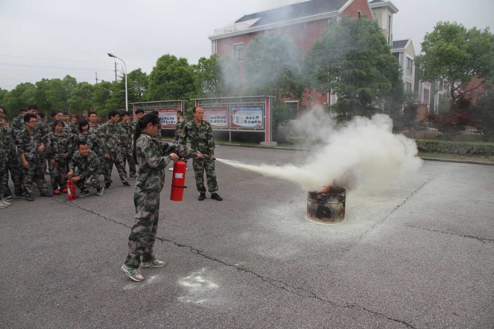 在训练场上,同学们跟着教官认真学习干粉灭火器使用方法并现场操作。何教官讲到:“使用干粉灭火器灭火时要将灭火器提到距火源适当位置后,先上下颠倒几次,使筒内的干粉松动,拔去保险销,然后让喷嘴对准火焰根部,压下压把,灭火剂便会喷出灭火。若在室外,应选择在上风方向喷射。”在操作环节,教官在事先准备好的铁桶里点起火源,男同学们一个个跃跃欲试,部分女同学有些胆怯,但在教官的鼓励和指导下,一个女生开始尝试,并扑灭火源。有了成功的例子,女同学们也一个个尝试起来。不一会儿所有的学生都成功扑灭火源。