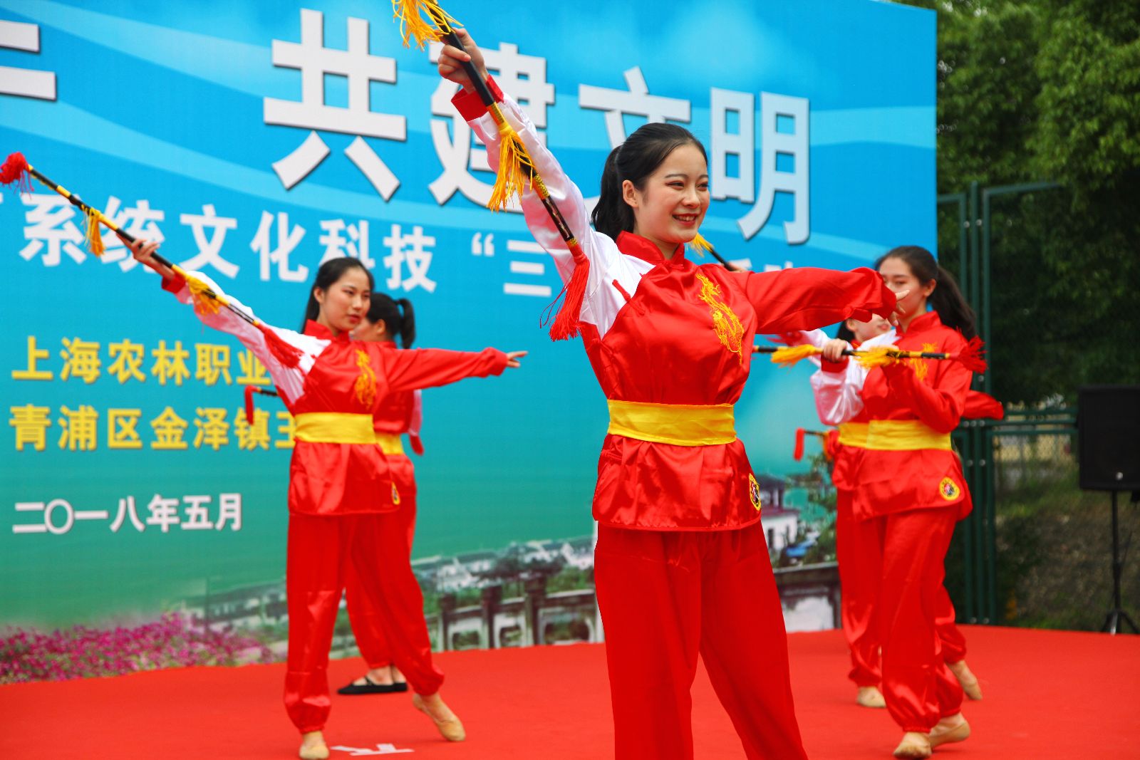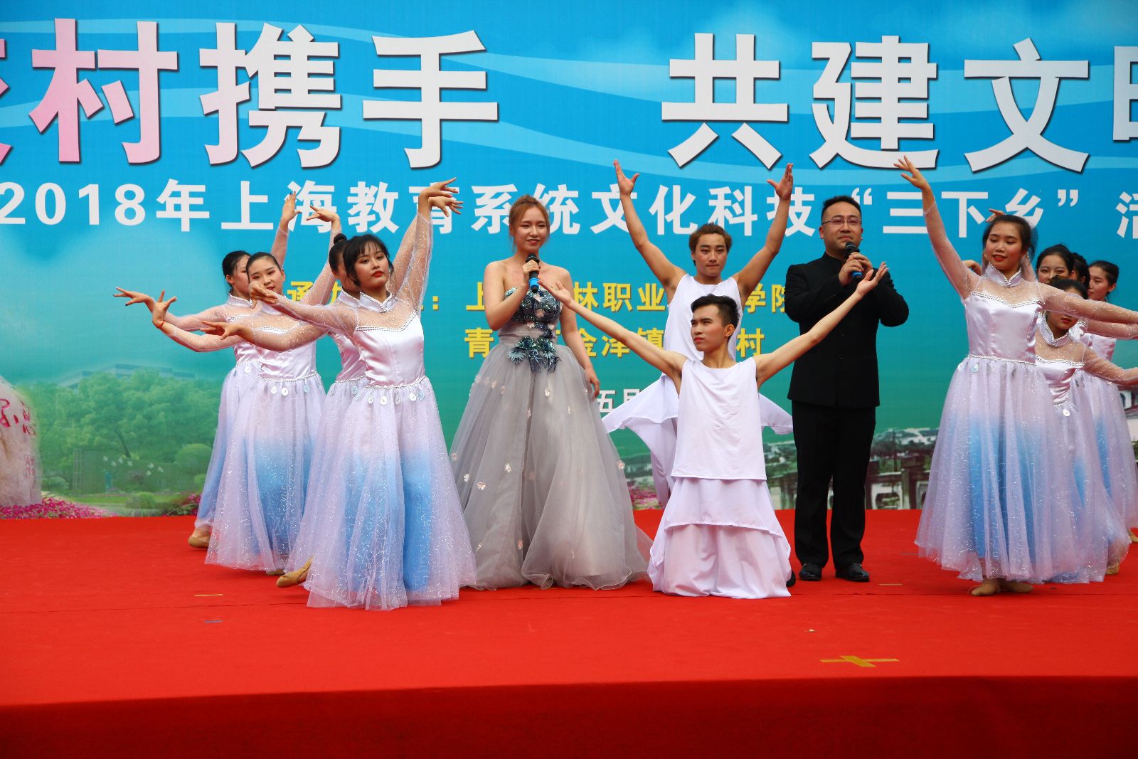 文艺演出博得村民阵阵喝彩,将活动推向高潮。舞龙队的姑娘们英姿飒爽,技艺娴熟;大学生艺术团歌声嘹亮,表演到位;舞蹈《莲湘闹春》融合特有的淳朴民风,平稳流畅,活泼轻快;《十九大精神放光芒》快板表演展现出新时代大学生的精神风貌;现场插花表演让村民们大开眼界;现代舞《青春风采》充满节奏感,一首《我的祖国》跳出了学院舞蹈团的专业和水平;胡慧春老师潇洒的台风和悠扬的歌声,让《不忘初心》响彻王港村。金泽镇文广中心表演的颇具地方特色的锡剧和歌舞《墨梅》等节目穿插其中,受到村民们的喜爱。在环保知识有奖问答环节,现场气氛活跃,村民们踊跃抢答,其中一位小男孩答对了3个问题,捧着3盆绿植得意洋洋的样子,引得大家哈哈大笑。