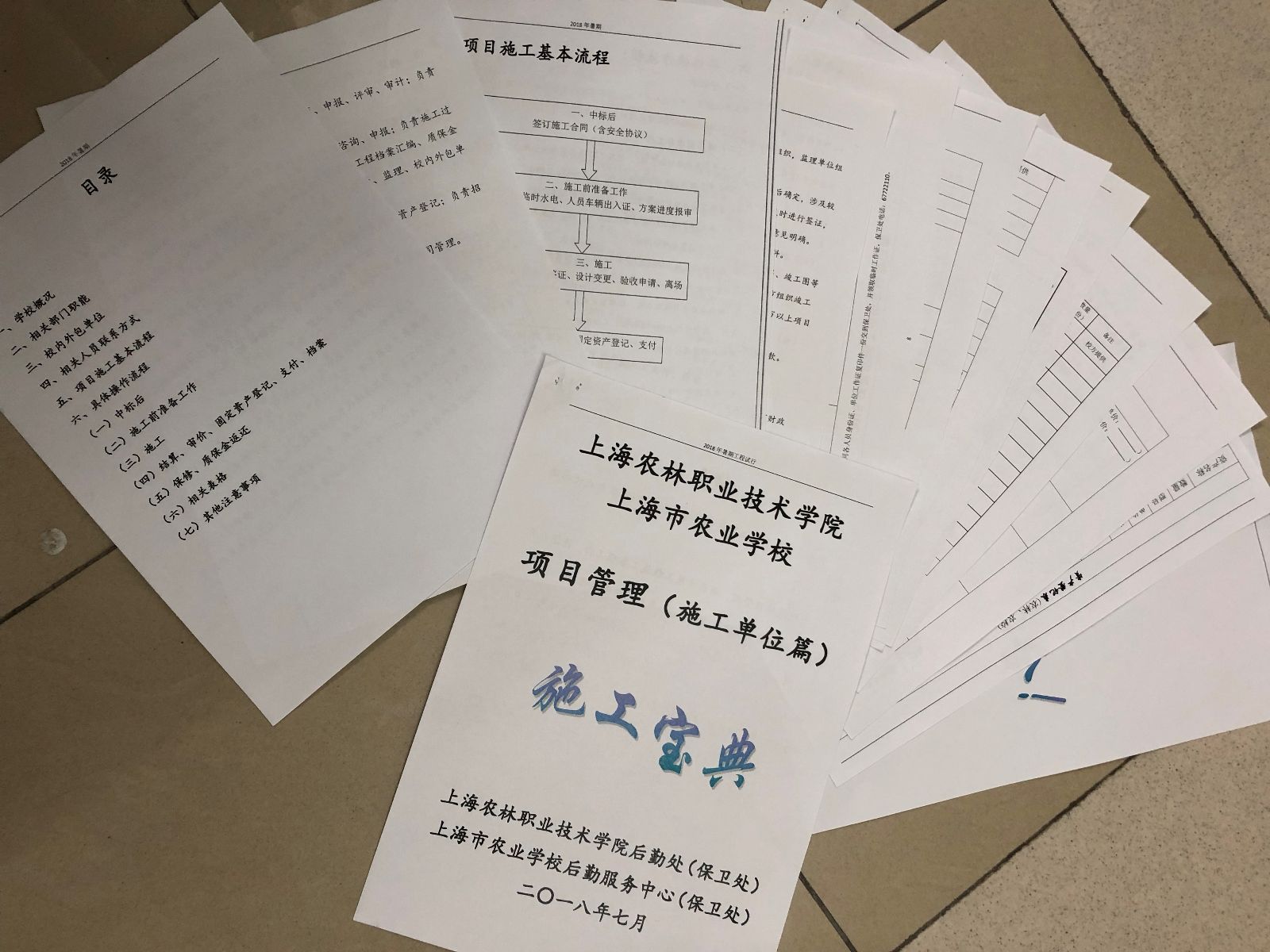 后勤处在管理上花费心思。为确保施工安全和工程质量,有力推进工作有序开展,工程建设过程中,部门严格执行市教委、市财政、市住建部等部门发布的文件精神,对达到备案规模的工程实行设计、招标代理、监理等网络备案工作,主动接受政府部门的监督。除往年的施工例会制度、监理制度、项目经理带班制、备案制度和廉政教育管理制度外,为提高项目现场管理水平,依据现行法律法规、结合学校实际,制定《施工宝典*施工单位篇》,进场施工前,每个施工队一份,使承揽我校项目的施工队明晰进场手续办理、重要节点事项,预防并减少不必要的管理矛盾。