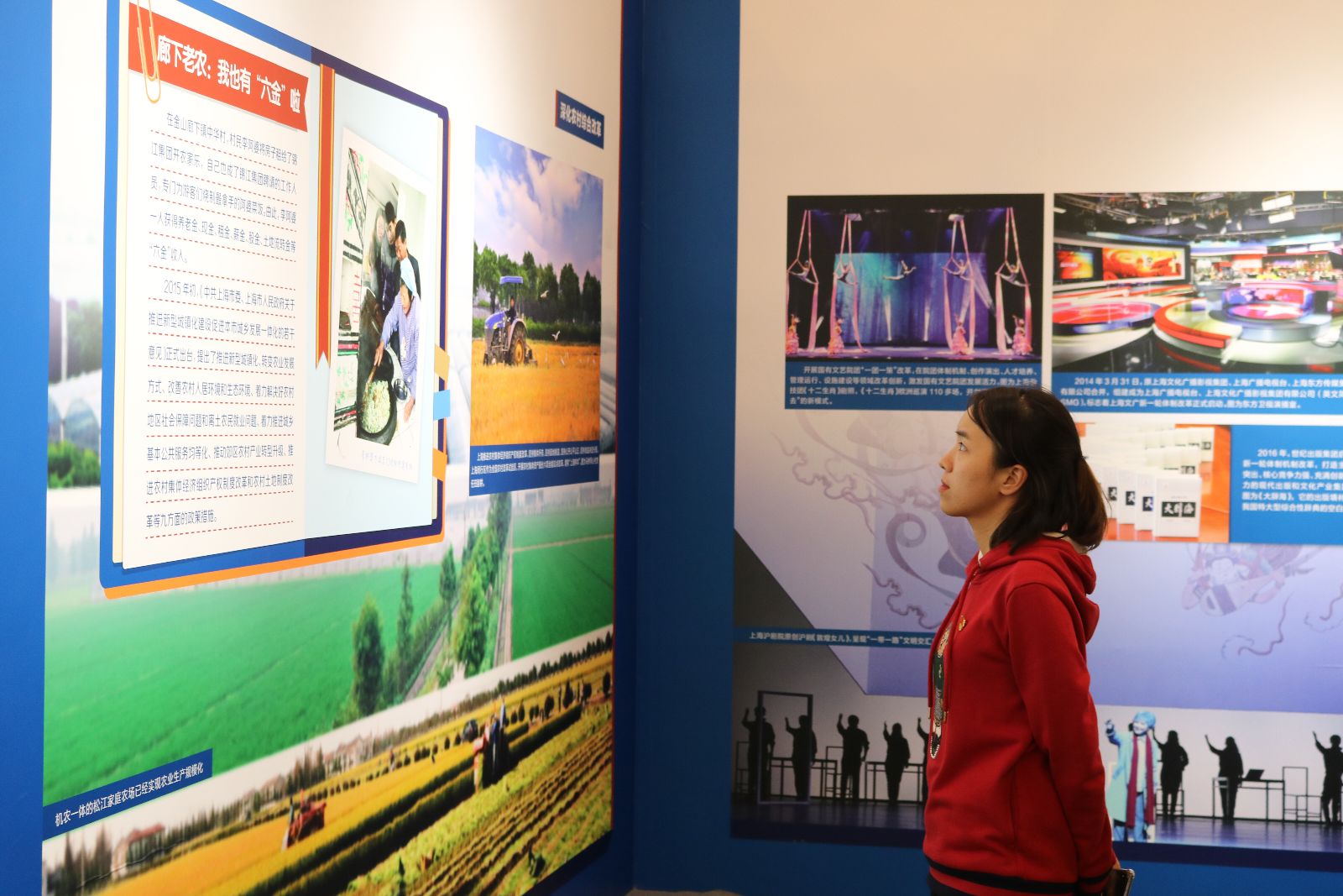 本次展览展区面积约3360平方米,分为序篇、负重前行谋突破(1978-1990)、实现跨越当“龙头”(1990-2012)、阔步迈进新时代(2012-2017)、改革开放再出发(2017-2035)等五个篇章,集中展示大量案例、摄影作品和立体模型,全面直观地展现出改革开放40年来上海所取得的重大突破和伟大成就,也分享了上海40年来发展过程中提炼的宝贵经验,特别是党的十八大以来改革开放和社会主义现代化建设取得的历史性成就、历史性变革。本次展览在图文、制景等基础上,充分运用多种新媒体、多媒体手段,增强了展览的吸引力、感染力、震撼力。当参观到“上海,生长的天际线;上海中心,上海之巅”的LED展示屏前时,师生们纷纷驻足观看,一同领略浦东发展魅力,体悟国家崛起速度。