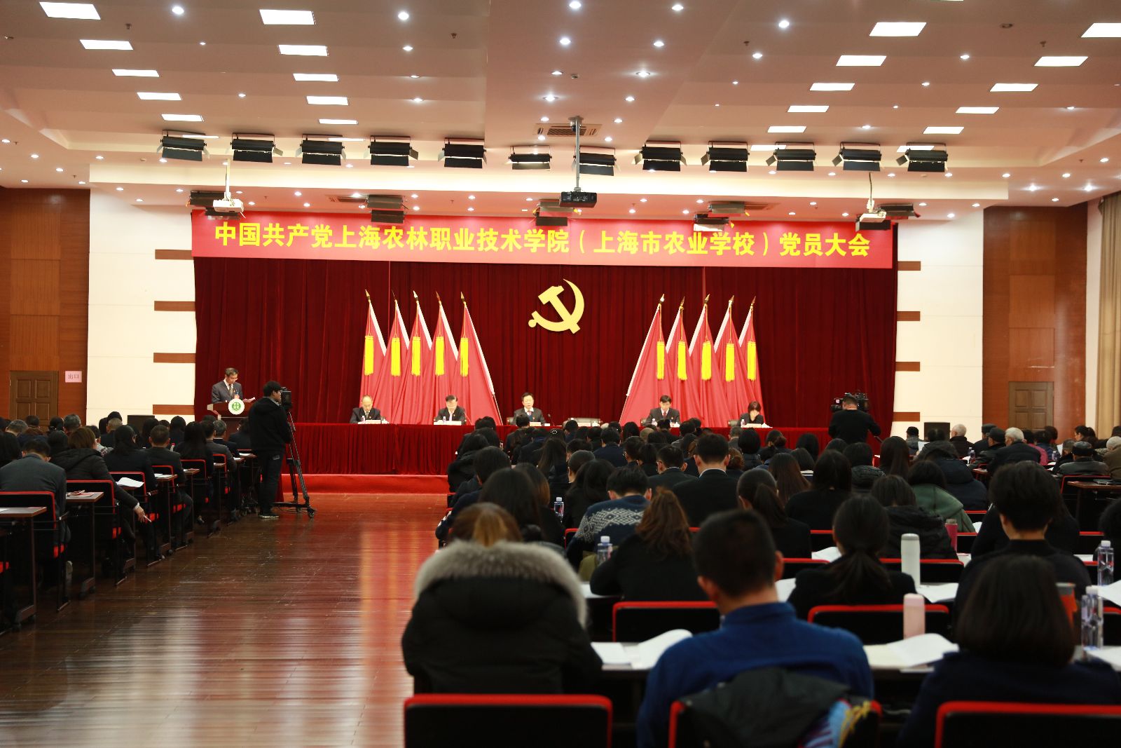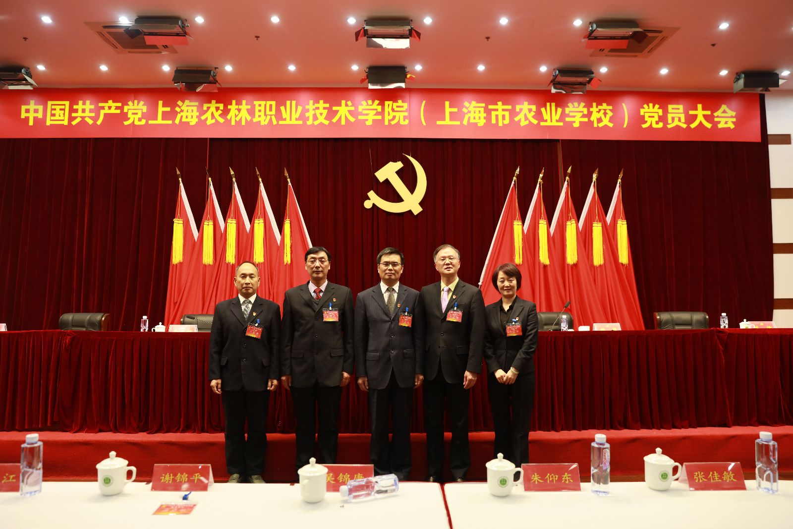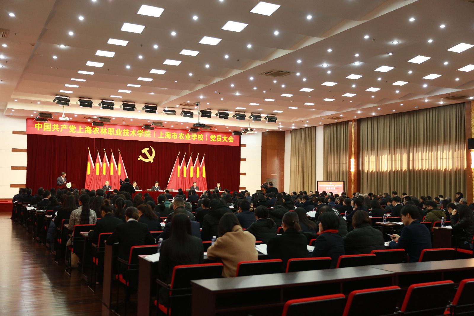 下午1点,大会在庄严的国歌声中开幕。主席台上方,悬挂着“中国共产党上海农林职业技术学院(上海市农业学校)党员大会”会标,后幕正中是镰刀和锤头组成的金色党徽,十面鲜艳的红旗分列两侧。