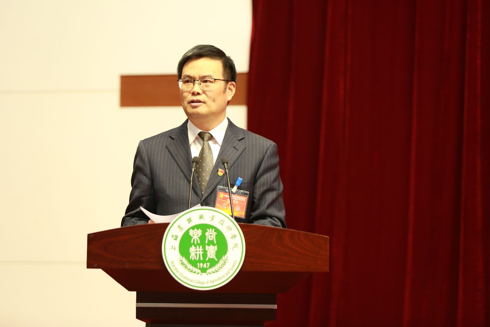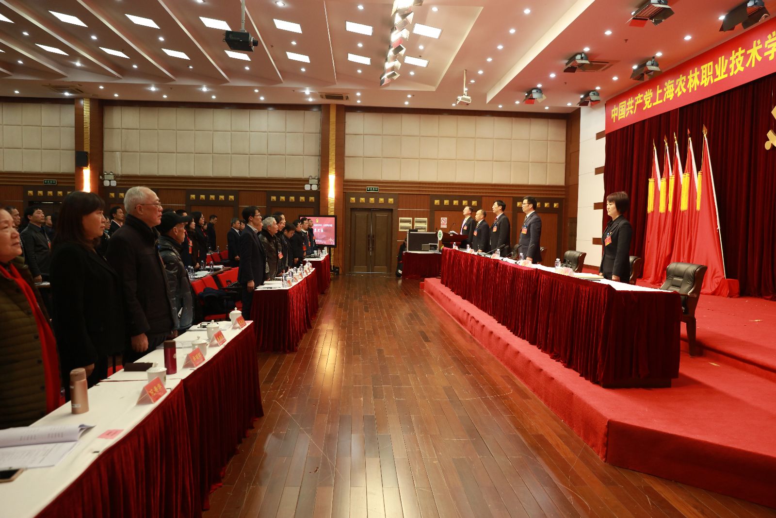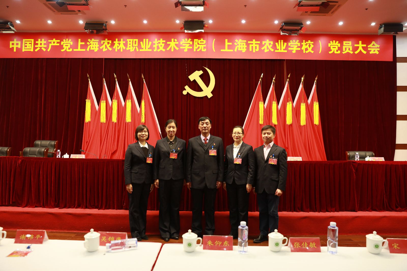 下午1点,大会在庄严的国歌声中开幕。主席台上方,悬挂着“中国共产党上海农林职业技术学院(上海市农业学校)党员大会”会标,后幕正中是镰刀和锤头组成的金色党徽,十面鲜艳的红旗分列两侧。