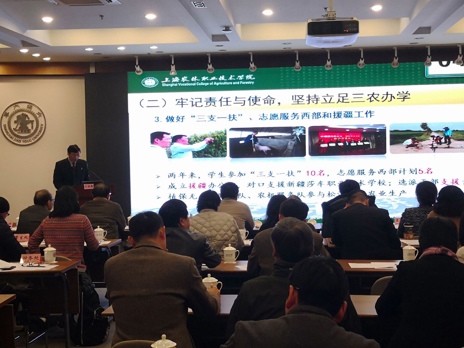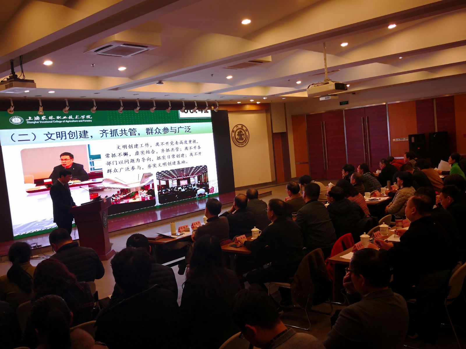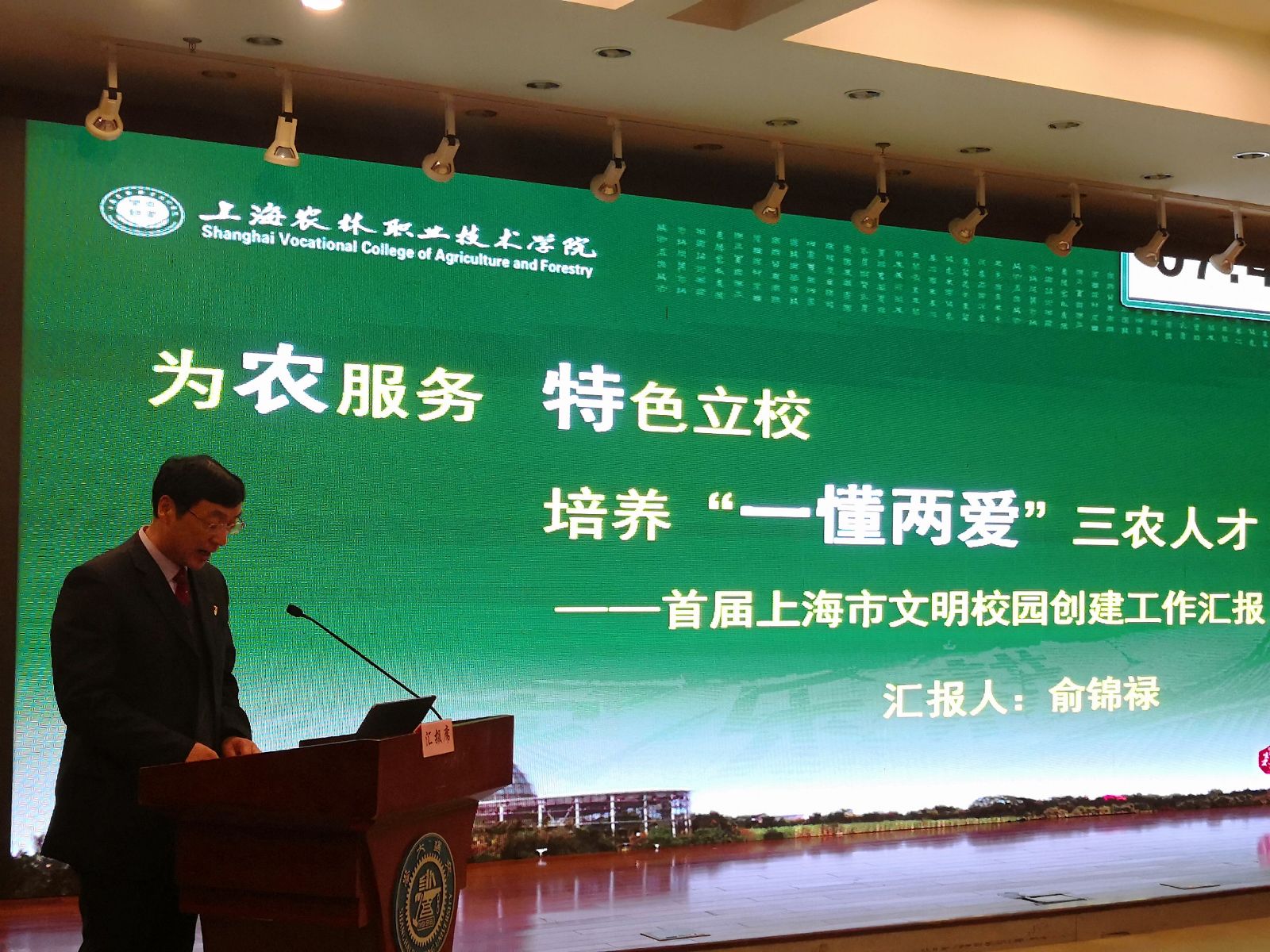 俞锦禄从学院发展概况、创建工作及主要成效、创建体会及下一步打算三个方面,全方位展示了两年来,作为上海唯一一所以现代都市农业为特色的高等职业技术学院,始终坚持立德树人,加强和改进新形势下思想政治工作,把“又红又专”放在重中之重;牢记责任与使命,坚持立足三农办学;大力弘扬 “尚农乐耕 生生不息”校训精神;践行社会主义核心价值观,弘扬农耕文化、传播农耕文明;坚持凝聚力工程建设,教职工乐意以校为家。全院上下风清气正,展现了干事创业的和谐校园的精神风貌。