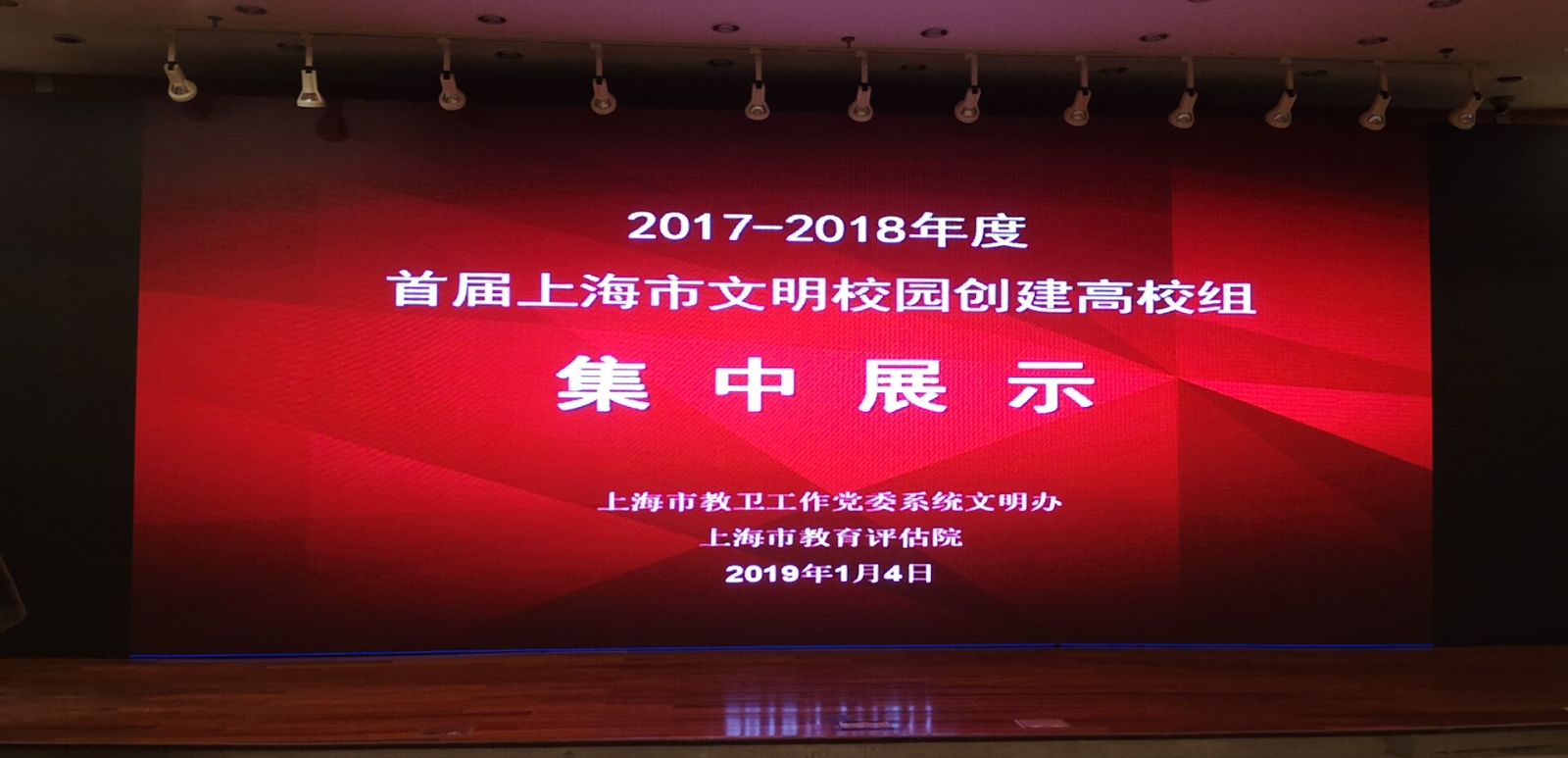 1月4日下午,在上海交通大学徐汇校区,市教卫工作党委系统文明办组织召开2017-2018年上海市文明校园创建终期考评集中展示会,来自全市32所高校参加集中展示汇报。我院党委副书记俞锦禄代表学院作文明创建工作汇报,宣传处樊清誉、谢伶俐参加汇报展示会。