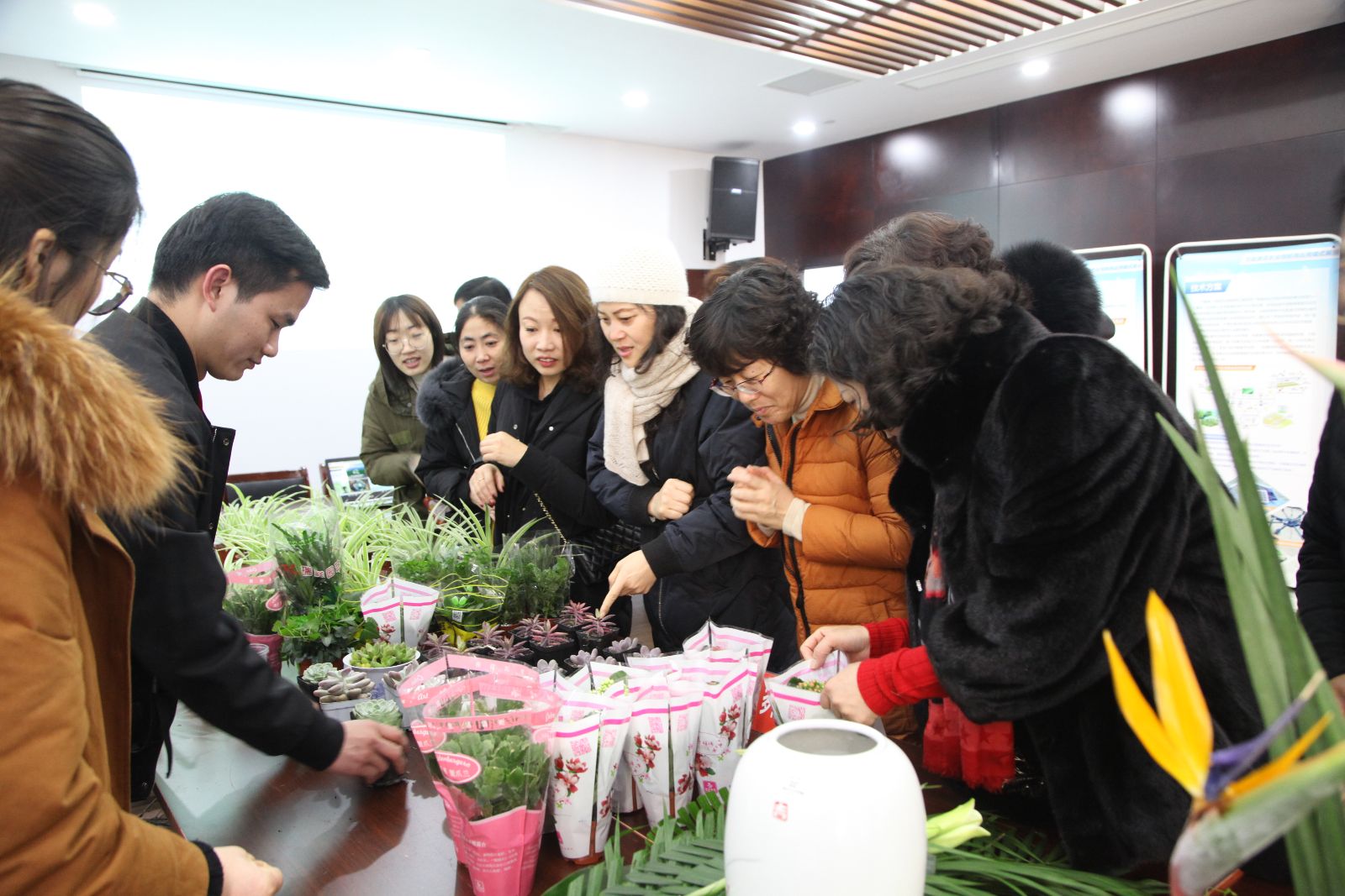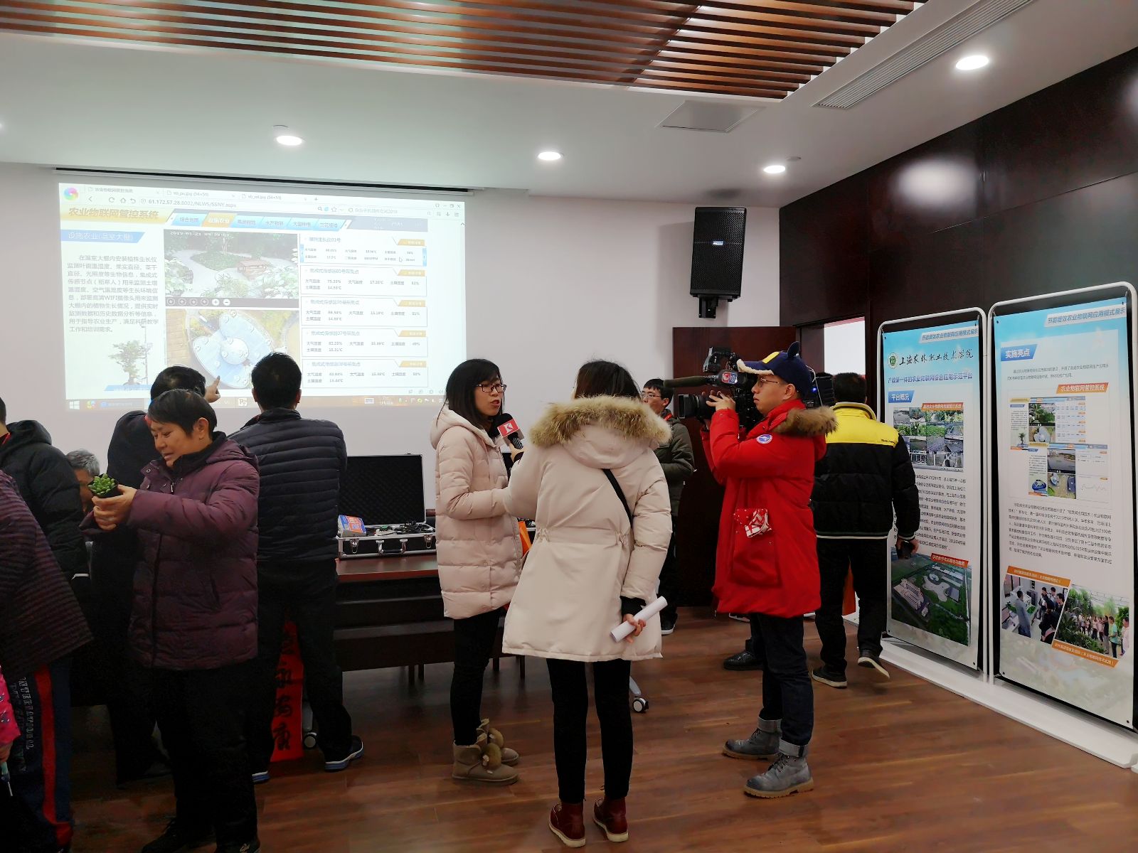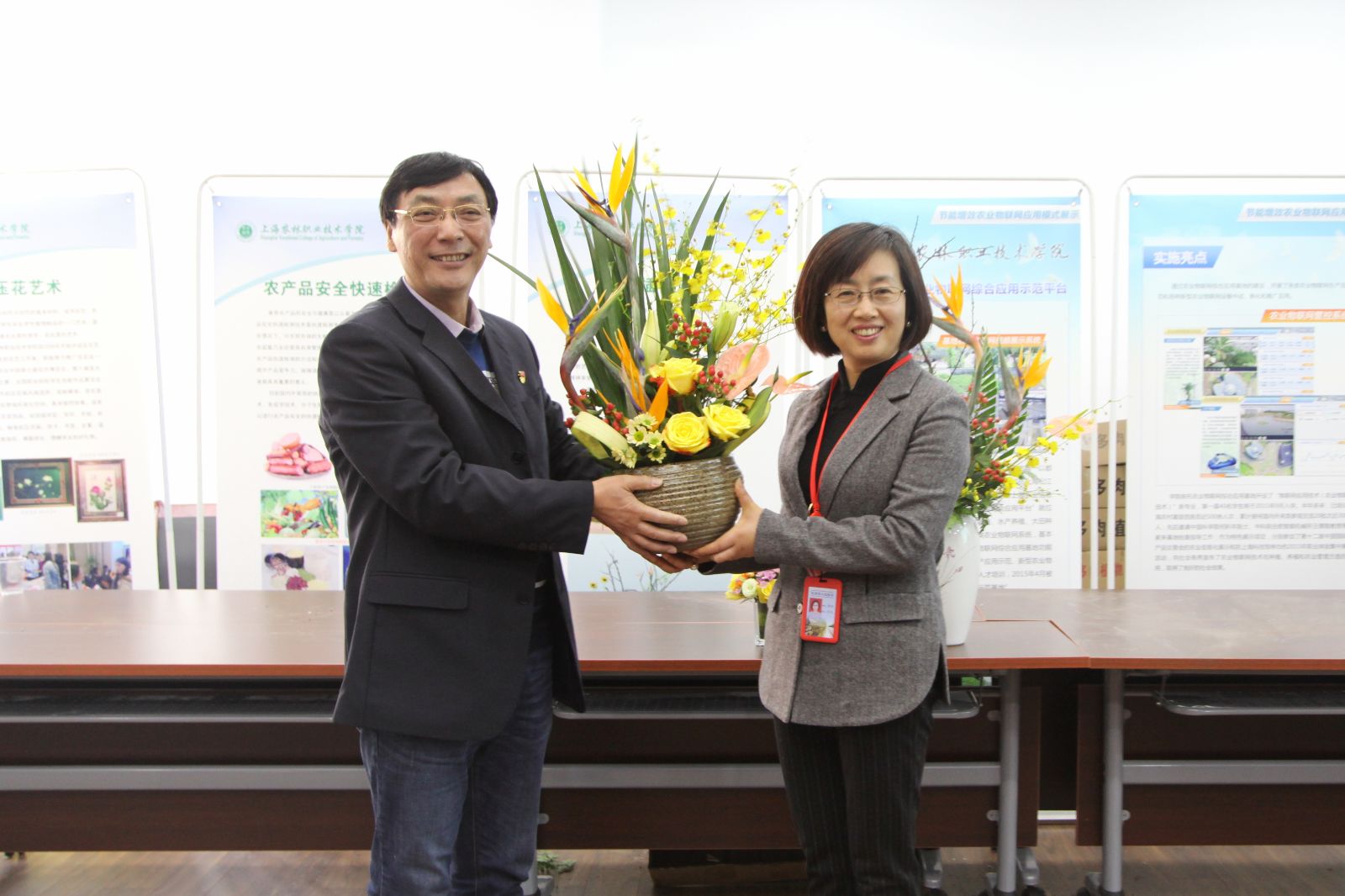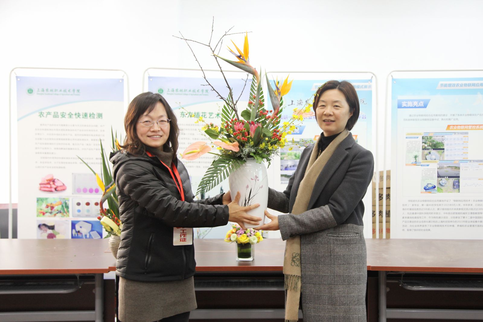 在学院代表市教委进行展示的现场,农生系范丽平老师和代书玲老师为村民们讲授“农产品快速检测”方法;孙修东主任,杨文明老师为村民们演示如何使用农业物联网管控系统,现场连线实训基地一分地、鱼池等时实性画面;俞平高主任为村民讲解如何养护绿色植物,两位插花能手现场展示东方现代插花艺术,周聪和司维为村民们送上绿色植物和盆栽。大家齐心协力为奉贤区柘林镇的村民们提供美、展示美、分享美,在活动结束时,由俞锦禄副书记,宣传处樊清誉分别把插花作品赠送给了柘林镇党委书记鲁瑛,党委副书记姚红。现场参与村民达到1000多人次,还吸引了上海观察、文汇报、东方网、周到上海等上海主流媒体进行采访报道。