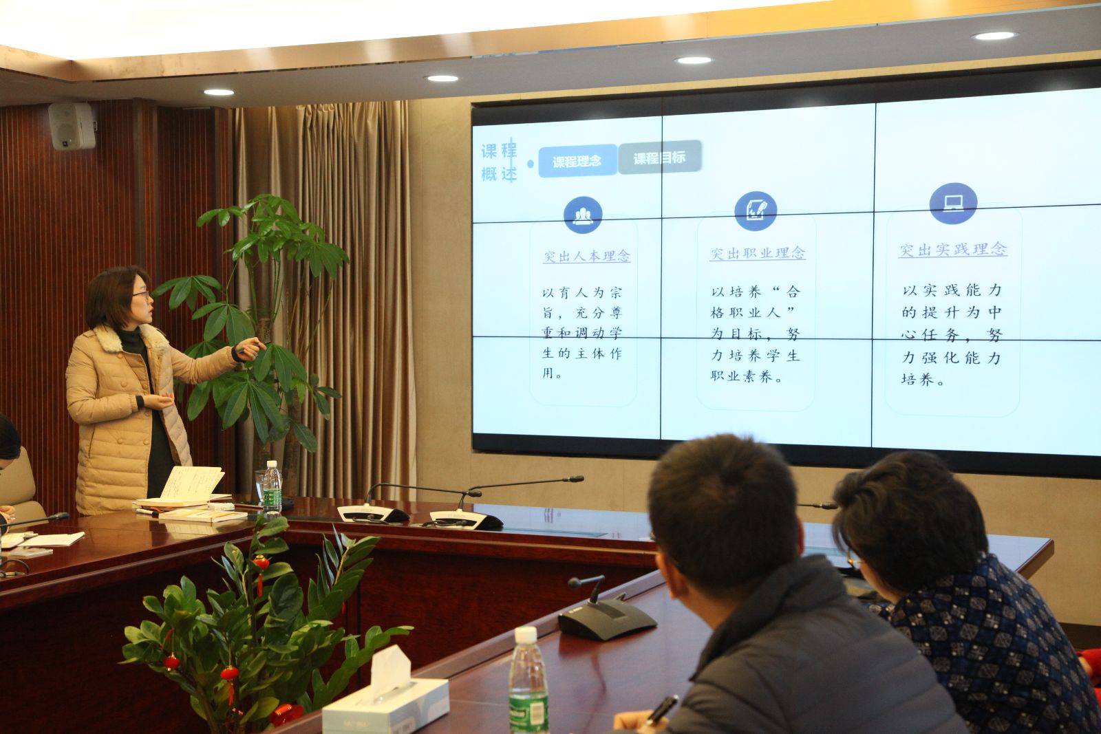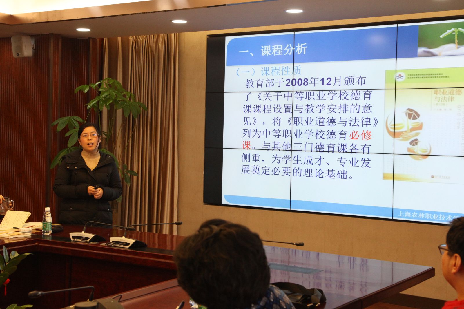 2016年和2017年进校的三位青年教师分别进行了15分钟课程说课。廖元春针对《思想道德修养与法律基础》,从课程概况、课程设计、课程实施、课程考核、特色与创新五个方面进行说课,着重介绍课程概况。王欢欢针对《职业道德与法律》,从课程分析、学情分析、教学资源、课程实施、课程考核五个方面进行说课,着重介绍了活动设计。路珧从中职阶段要接触到的四门德育课程为切入点,分别从课程、考核要求、课时安排、为什么要学哲学四个方面的内容,对《哲学与人生》进行了说课,重点突出为什么要学这门课。