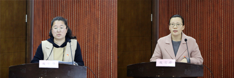 植科系党总支副书记高东菊和行政管理党支部书记谢伶俐作为代表汇报总支、支部“四史”学习教育开展情况。
