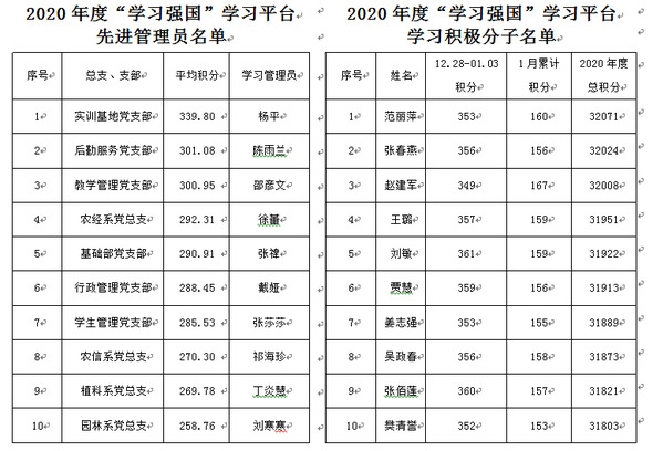 近期,市教卫工作党委对2020年度“学习强国”学习平台排名前十的高校总管理员,各高校10名二级组织学习管理员和10名学习积极分子予以奖励。2020年度,学院党委在“学习强国”学习平台排名前十,学院总管理员王泓澄被评为先进总管理员。根据学院 2020年度学习积分情况,按照总支、支部周人均积分由高到低排名,“学习强国”学习平台管理员杨平等10名同志被评为“学习强国”学习平台先进管理员;按照个人总积分由高到低排名,范丽萍等10名同志被评为“学习强国”学习平台学习积极分子。