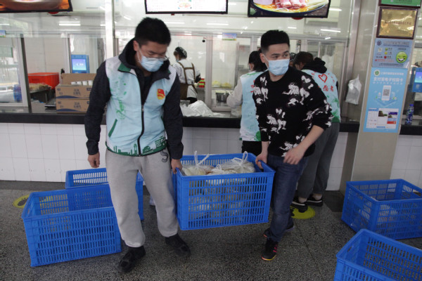 一份份热腾腾的盒饭在校园里迅速传递