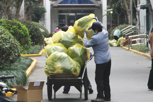 垃圾丢入指定的医废垃圾袋中