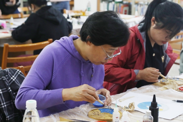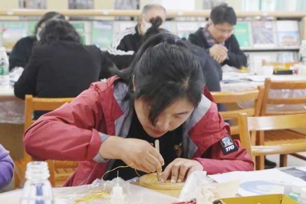 “掐丝珐琅是中国传统工艺品,造型特异,制作精美……”活动现场,主讲教师介绍了掐丝珐琅的历史起源、发展历程、艺术价值等,详细介绍了掐丝工艺的操作手法和使用工具。掐丝珐琅又称景泰蓝,是国家级非物质文化遗产,是指在金、铜胎上用金丝或铜丝掐出图案,填上各种颜色后经焙烧、研磨、镀金等多道工序而成的器皿,包括选图、描图、掐丝、点蓝等多道工序。