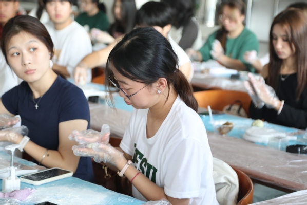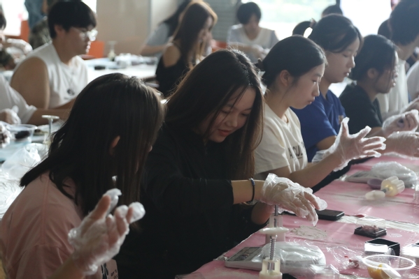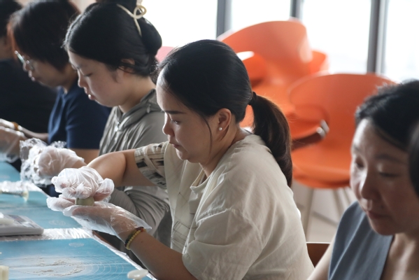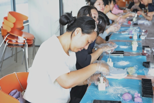 活动当天,阳光明媚,师生与泖港镇居民欢聚一堂。上午时分,一场别开生面的冰皮月饼制作活动拉开了序幕。在专业老师的指导下,大家纷纷动手尝试,将一块块冰皮面团灵巧地搓圆、压扁,再包裹进甜蜜的馅料,随后轻轻放入模具中按压成型。不多时,一个个晶莹剔透、造型各异的冰皮月饼便新鲜出炉,不仅增添了节日的喜庆气氛,更让参与者深刻体验到了中秋佳节的传统韵味与文化魅力。